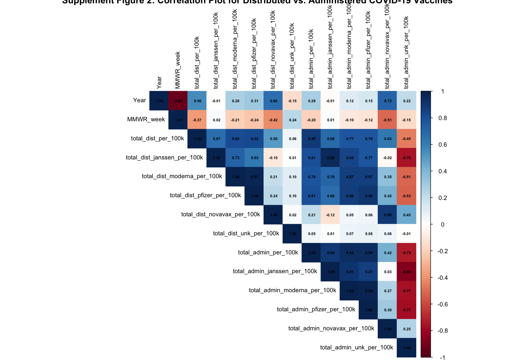 Figure two shows the correlations of specifically the distribution and administration variables in the dataset. The correlation between total_administered and total_distributed is 0.89; the correlation between total_admin_janssen and total_dist_janssen is 0.96; the correlation between total_admin_moderna and total_dist_moderna is 0.87; the correlation between total_admin_pfizer and total_dist_pfizer is 0.90; the correlation between total_admin_novavax and total_dist_novavax is 0.90, which is the lowest of all manufacturers; and the correlation between total_admin_unk and total_dist_unk is -0.01. The distributed and administered unknown variables are likely a part of this dataset due to poor data recording.