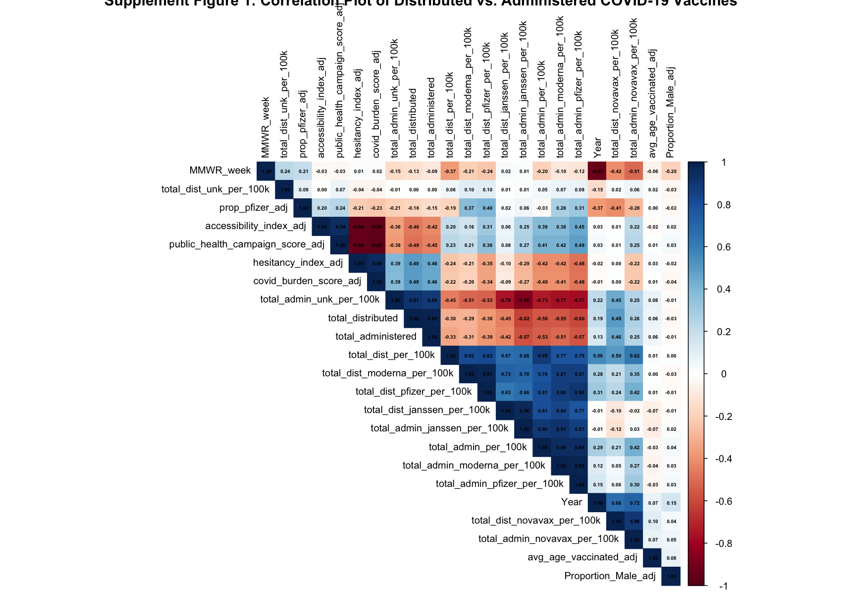 Figure one displays the correlations between all variables within the COVID-19 vaccine population adjusted dataset.