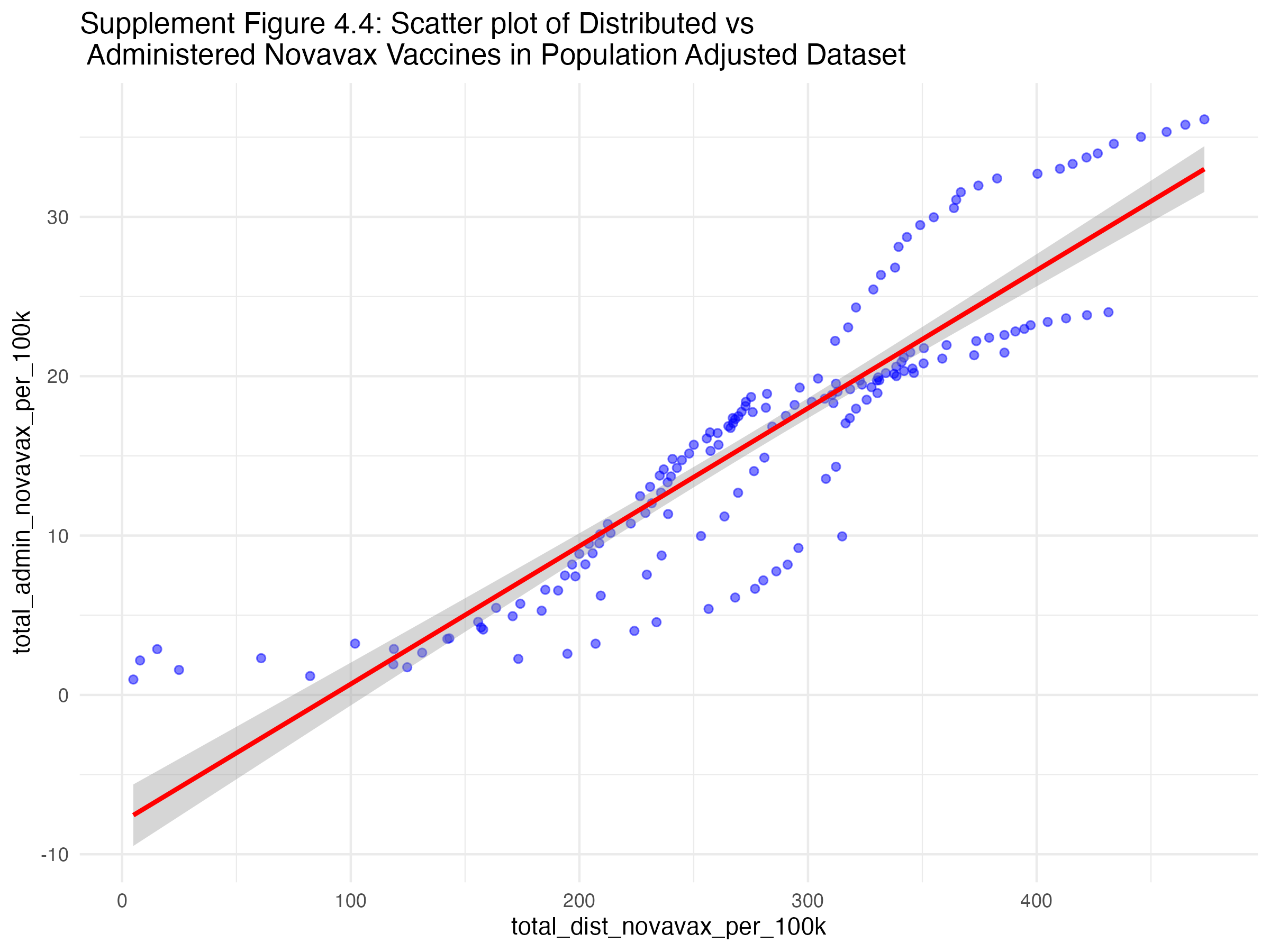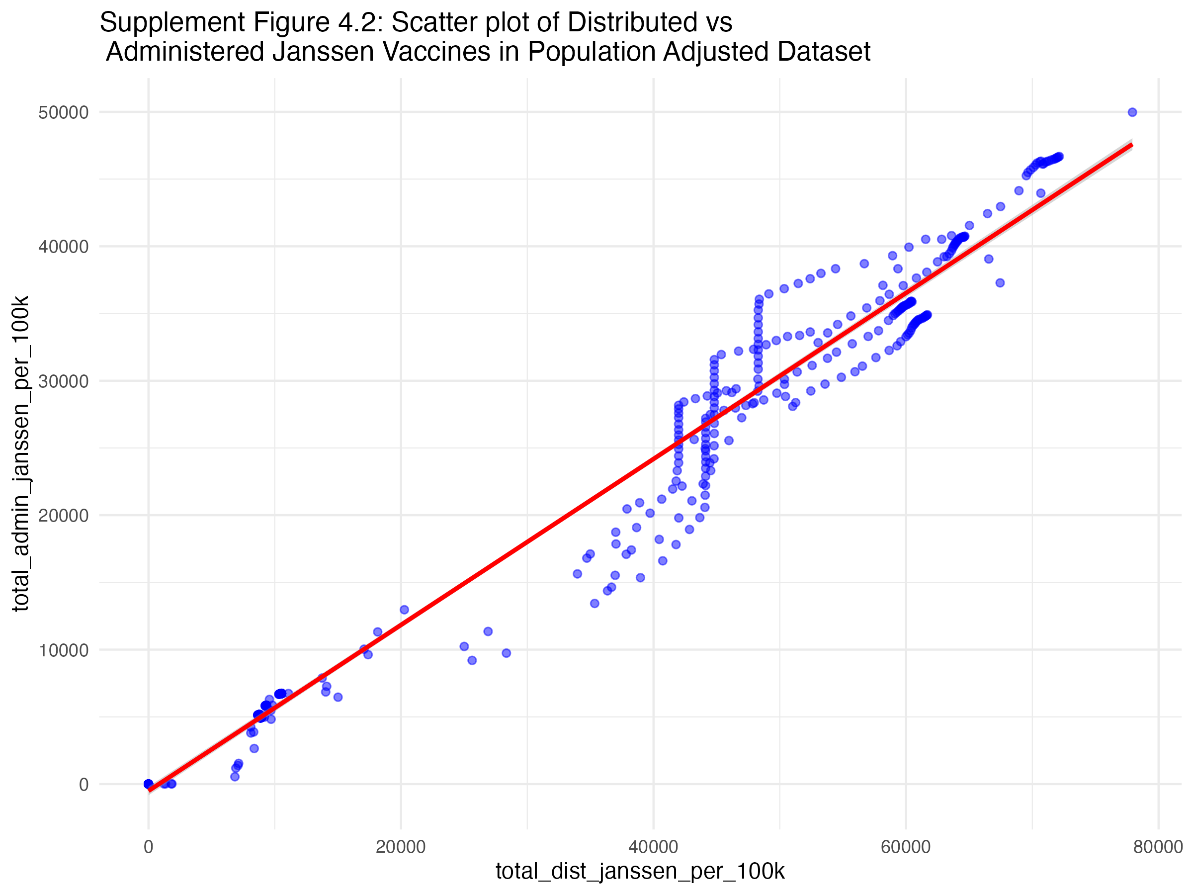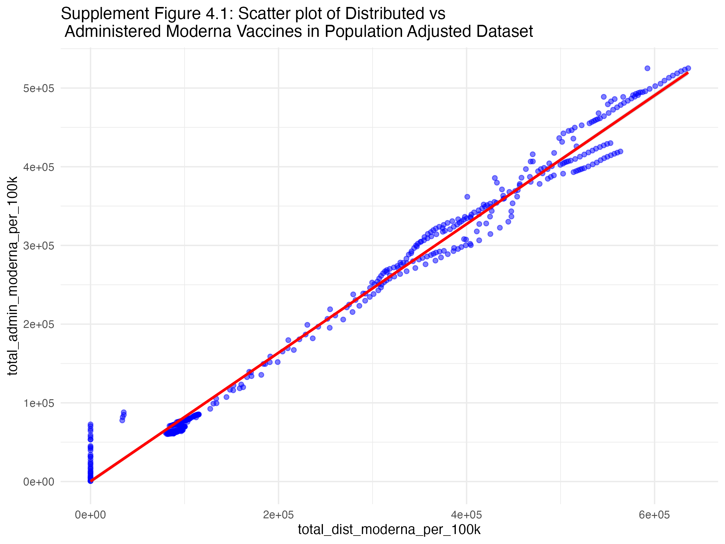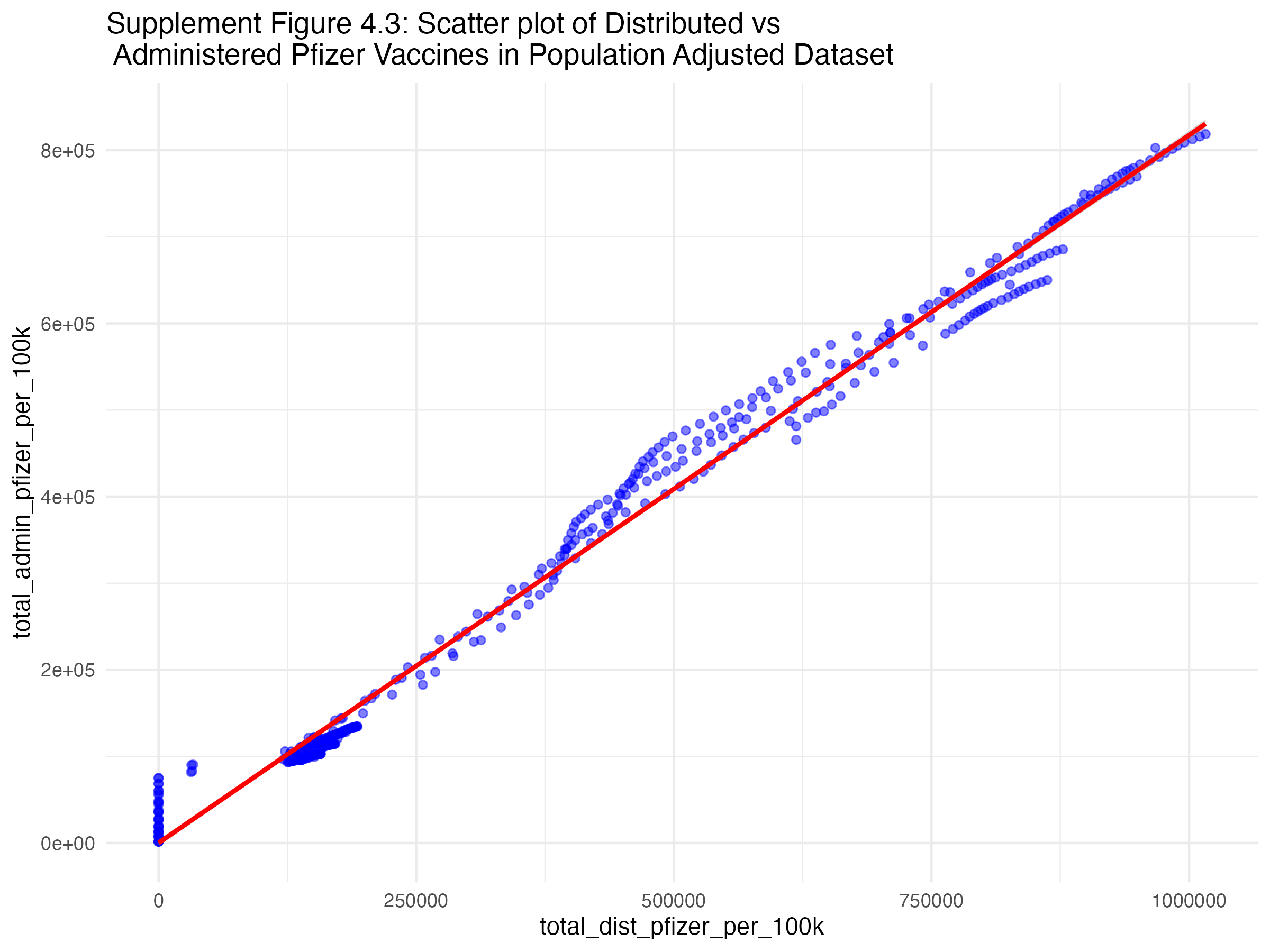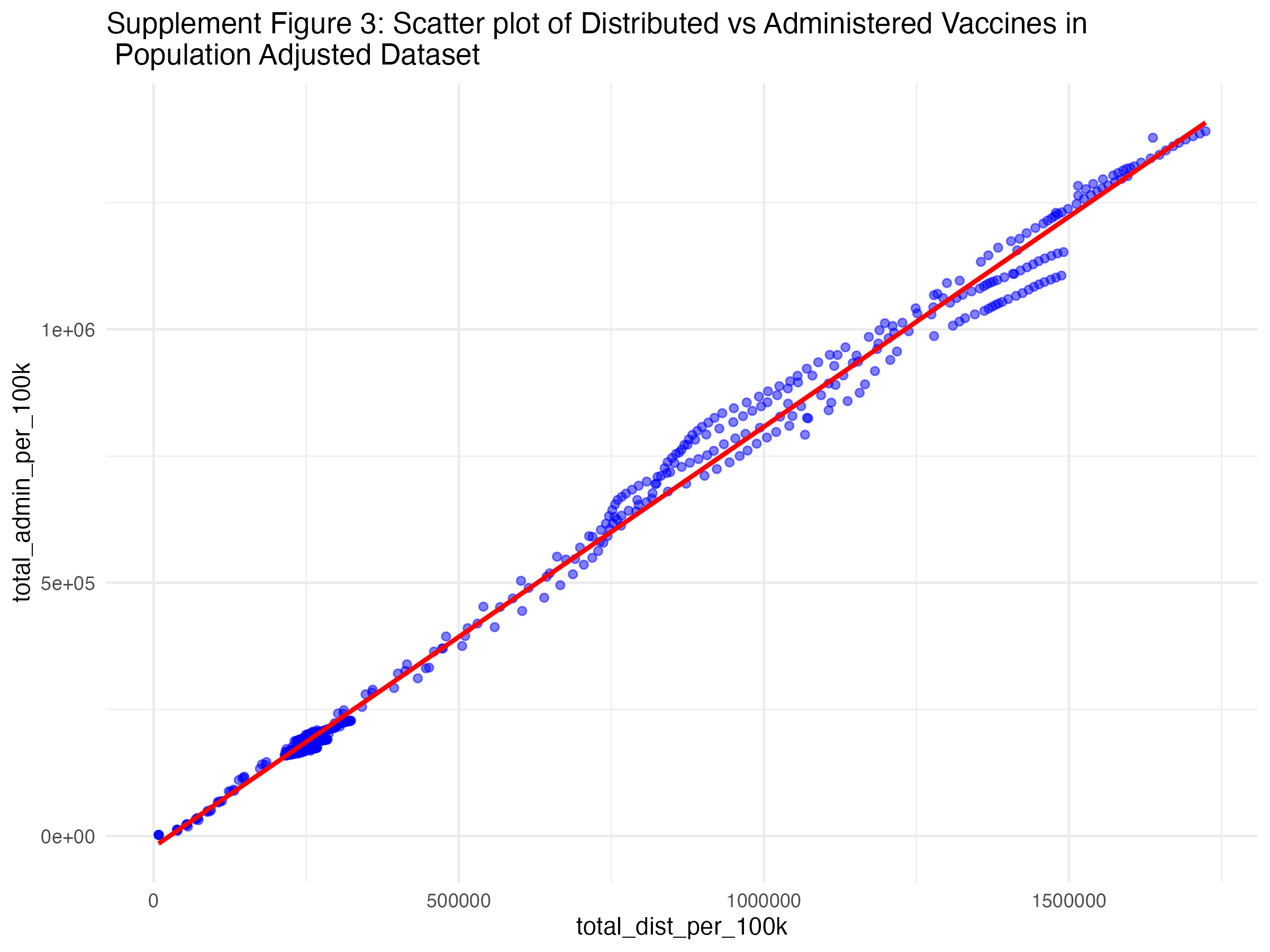 Below, you will several scatterplots. Figure three is an overall scatterplot of the relationship between administered and distributed doses. The points closely follow the diagonal line, indicating a strong relationship between the two variables (confirmed by the correlation coeffecient of 0.89).