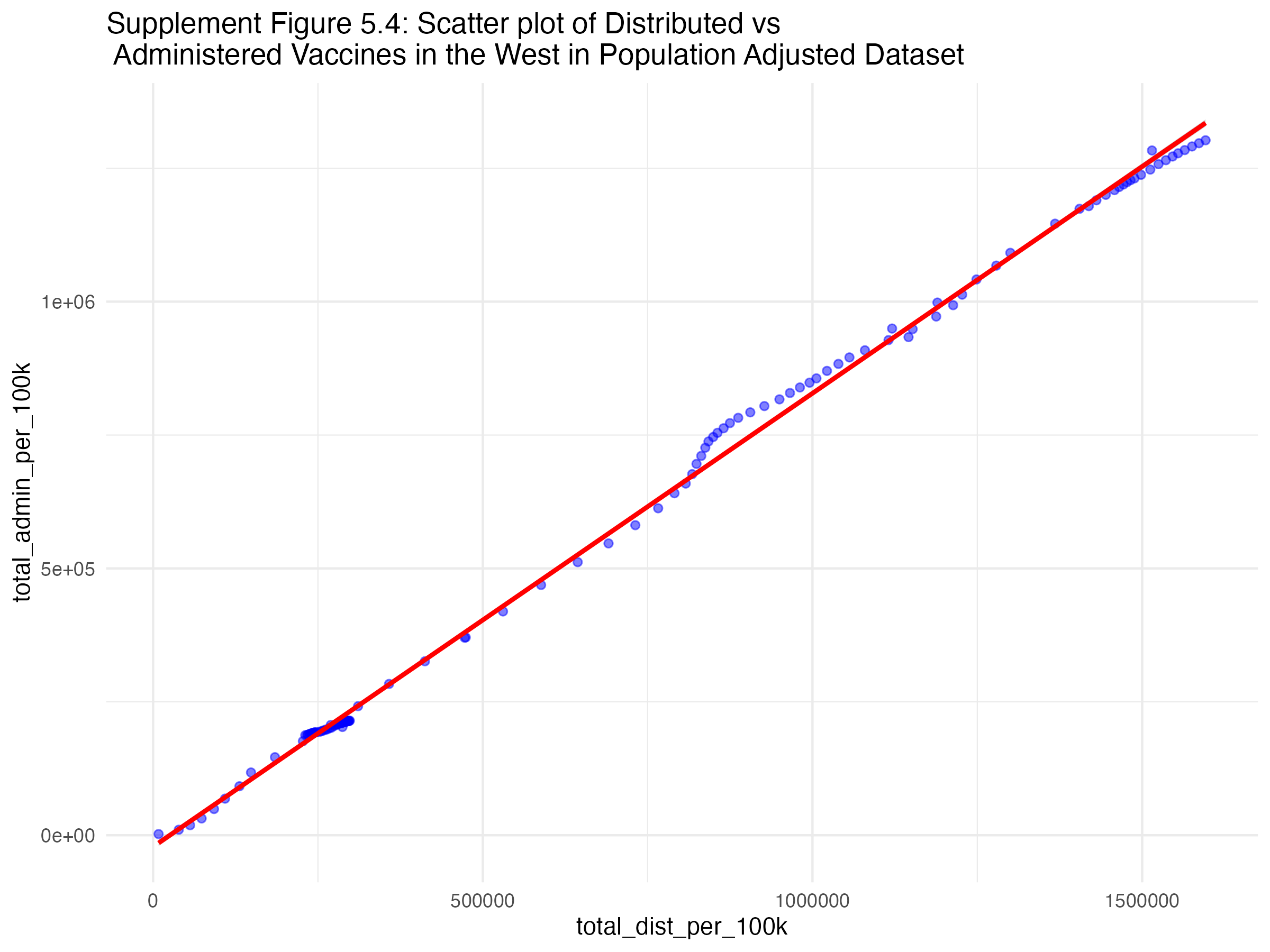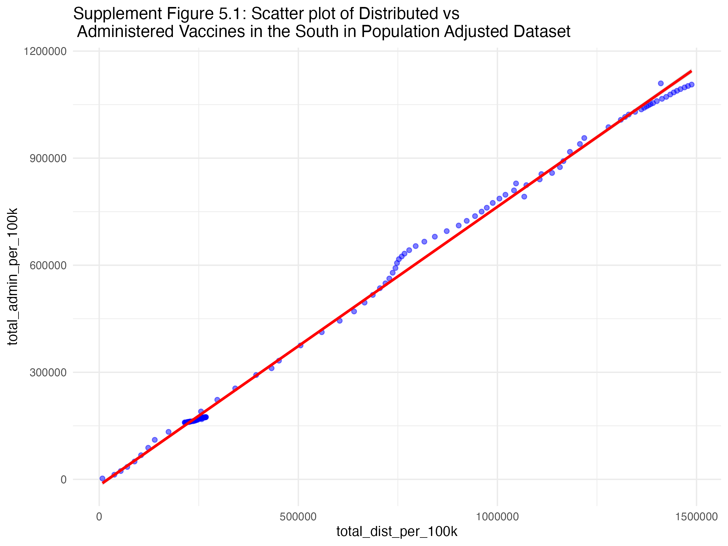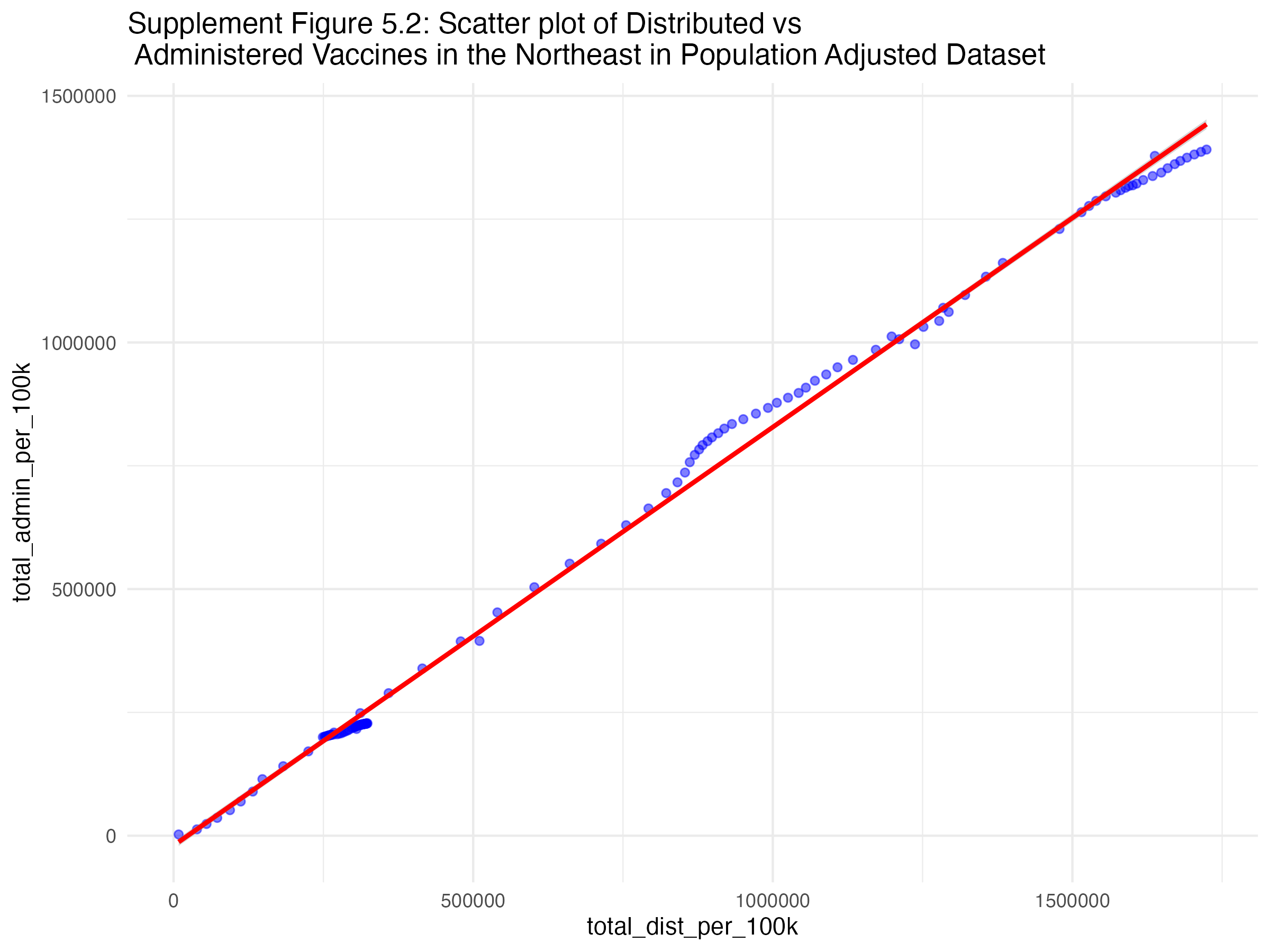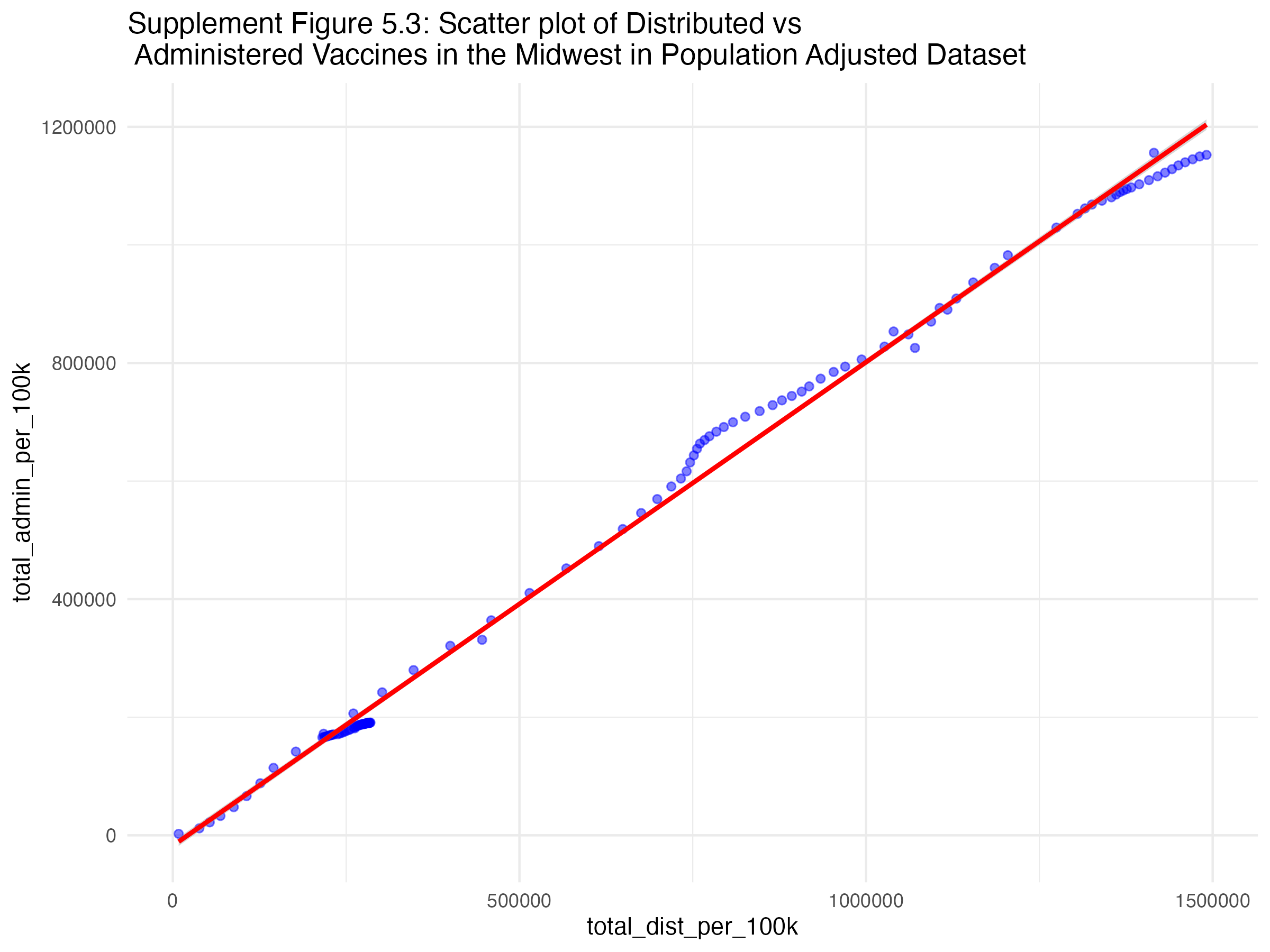 Figures 5.1, 5.2, 5.3, and 5.4 show the scatterplots of the relationship between administered and distributed doses for each region of the U.S..