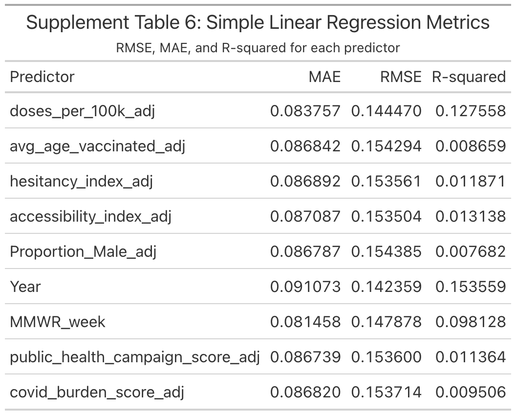 Table 6 shows the Simple Linear Regression Metrics results from the modeling analysis.