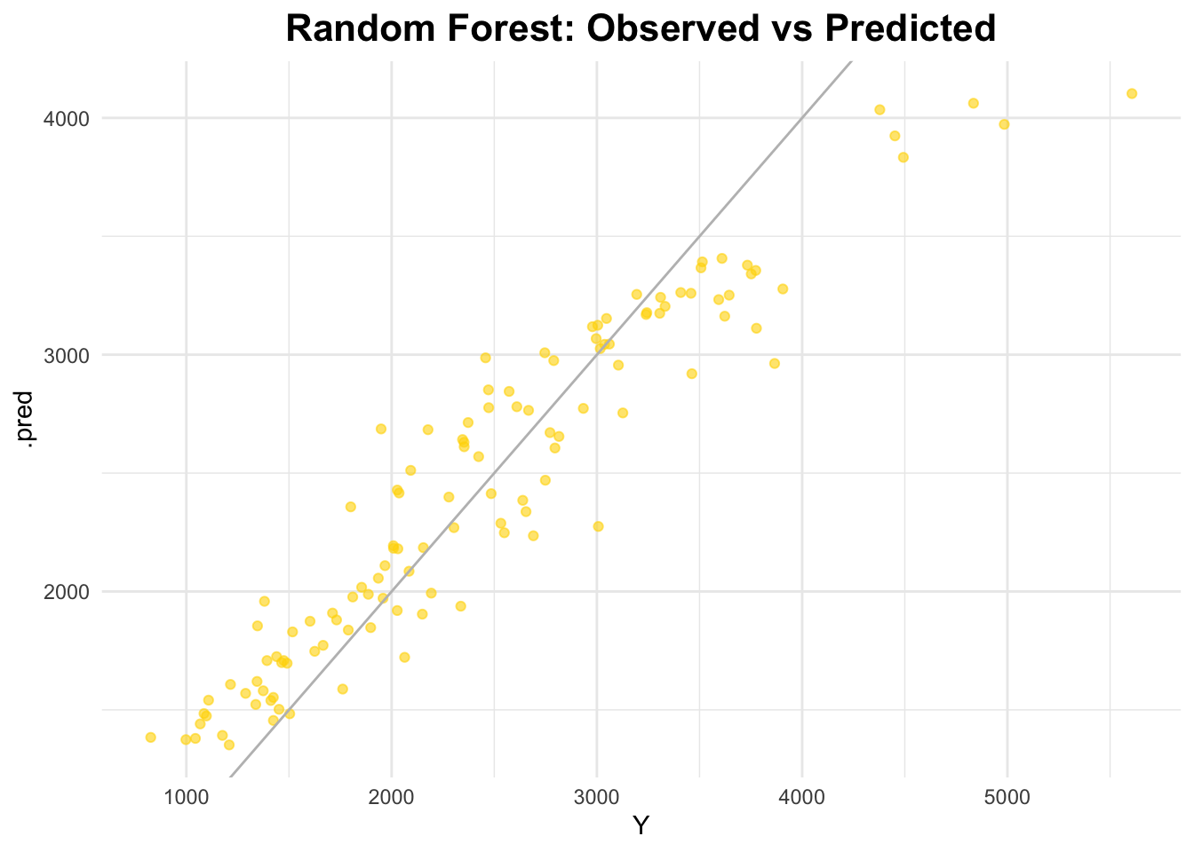 # plot observed vs predictedggplot(rf_predictions, aes(x = Y, y = .pred)) +geom_point(alpha =0.6, color ="gold") +geom_abline(slope =1, intercept =0, color ="gray") +labs(title ="Random Forest: Observed vs Predicted") +theme_minimal() +theme(plot.title =element_text(hjust =0.5, # center the titleface ="bold", # make title boldsize =16) # make title bigger )