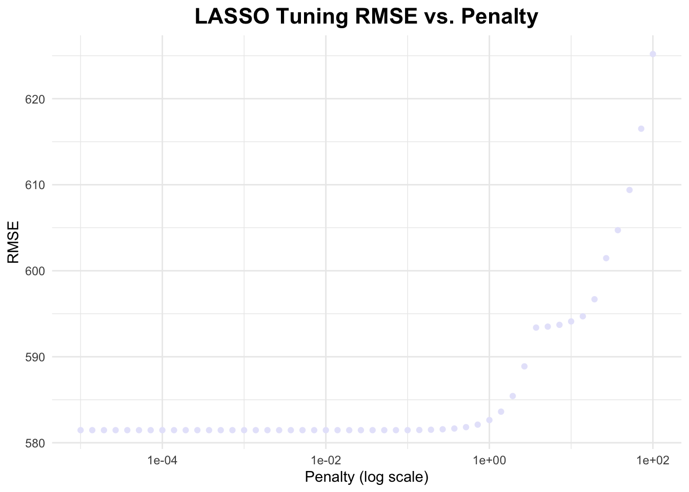 # define penalty gridpenalty_grid <-10^seq(log10(1E-5), log10(1E2), length.out =50) # 50 values from 1E-5 to 1E2# define LASSO model lasso_model <-linear_reg(penalty =tune()) %>%set_engine("glmnet") %>%set_mode("regression")# create workflowlasso_workflow <-workflow() %>%add_model(lasso_model) %>%add_formula(Y ~ .)# create resampling resamples <-apparent(data)# tuning lasso_tuning_results <-tune_grid( lasso_workflow,resamples = resamples,grid =tibble(penalty = penalty_grid),metrics =metric_set(rmse),control =control_grid(save_pred =TRUE) # Ensure predictions are stored)# tuning resultslasso_results <-collect_metrics(lasso_tuning_results)lasso_tune_rmse <- lasso_tuning_results$.metrics[[1]]# graphing RMSE vs. penaltyggplot(lasso_tune_rmse, aes(x = penalty, y = .estimate)) +geom_point(color ="lavender") +scale_x_log10() +labs(title ="LASSO Tuning RMSE vs. Penalty",x ="Penalty (log scale)",y ="RMSE") +theme_minimal() +theme(plot.title =element_text(hjust =0.5, # center the titleface ="bold", # make title boldsize =16) # make title bigger )