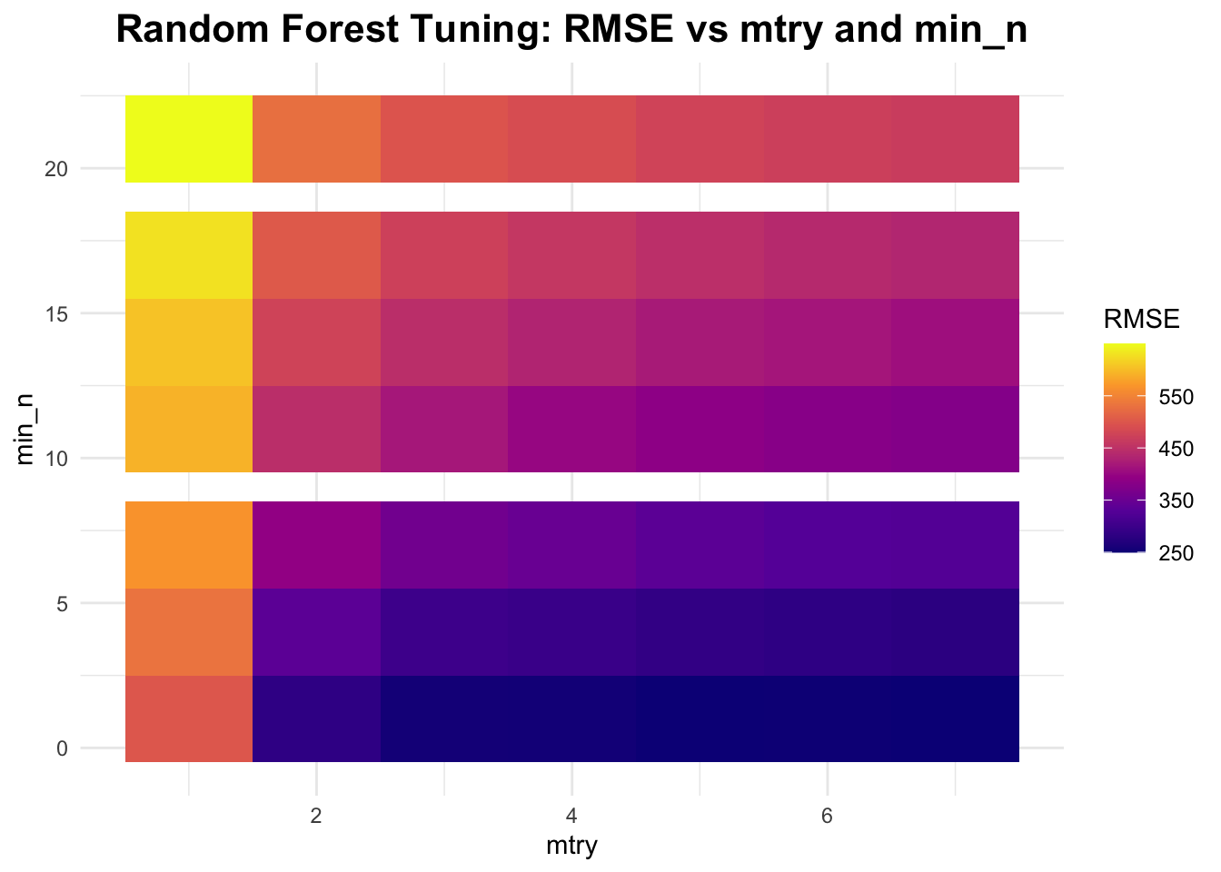 # define the model specification using the ranger engine, with fixed trees at 300rf_tuning <-rand_forest(mode ="regression",mtry =tune(), min_n =tune(), trees =300) %>%set_engine("ranger", seed = rngseed)# create a workflowrf_tuning_workflow <-workflow() %>%add_model(rf_tuning) %>%add_formula(Y ~ .)# tuning gridrf_grid <-grid_regular(mtry(range =c(1, 7)), # mtry between 1 and 7min_n(range =c(1, 21)), # min_n between 1 and 21levels =7# 7 levels for each parameter to get 7 x 7 tuning parameters)# create resamplesresamples <-apparent(data)# tuningrf_tune_results <-tune_grid( rf_tuning_workflow,resamples = resamples,grid = rf_grid,metrics =metric_set(rmse),control =control_grid(save_pred =TRUE) )# tuning resultsrf_results <- rf_tune_results$.metrics[[1]]rf_results_df <-as.data.frame(rf_results) # data frame of results# create plotggplot(rf_results_df, aes(x = mtry, y = min_n, fill = .estimate)) +geom_tile() +scale_fill_viridis_c(option ="plasma") +# plasma colorslabs(title ="Random Forest Tuning: RMSE vs mtry and min_n",x ="mtry", y ="min_n", fill ="RMSE") +theme_minimal() +theme(plot.title =element_text(hjust =0.5, # center the titleface ="bold", # make title boldsize =16) # make title bigger )