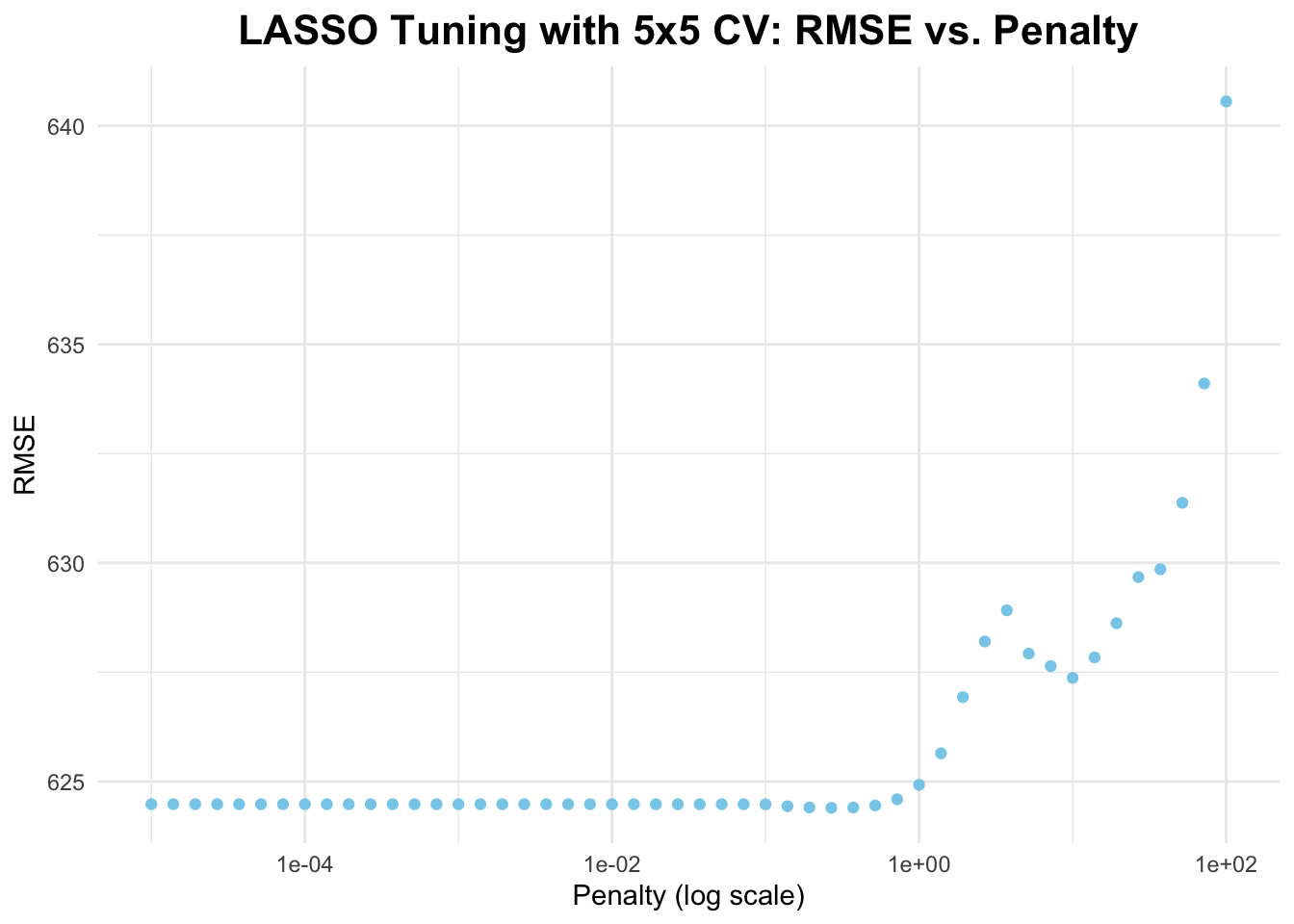 # create 5x5 cross-validation objectcv_folds <-vfold_cv(data, v =5, repeats =5)# tune LASSO model using CVlasso_cv_results <-tune_grid( lasso_workflow,resamples = cv_folds,grid =tibble(penalty = penalty_grid),metrics =metric_set(rmse),control =control_grid(save_pred =TRUE))# resultslasso_cv_results_df <-collect_metrics(lasso_cv_results)# plot resultsggplot(lasso_cv_results_df, aes(x = penalty, y = mean)) +geom_point(color ="skyblue") +scale_x_log10() +labs(title ="LASSO Tuning with 5x5 CV: RMSE vs. Penalty",x ="Penalty (log scale)",y ="RMSE") +theme_minimal() +theme(plot.title =element_text(hjust =0.5, face ="bold", size =16) )