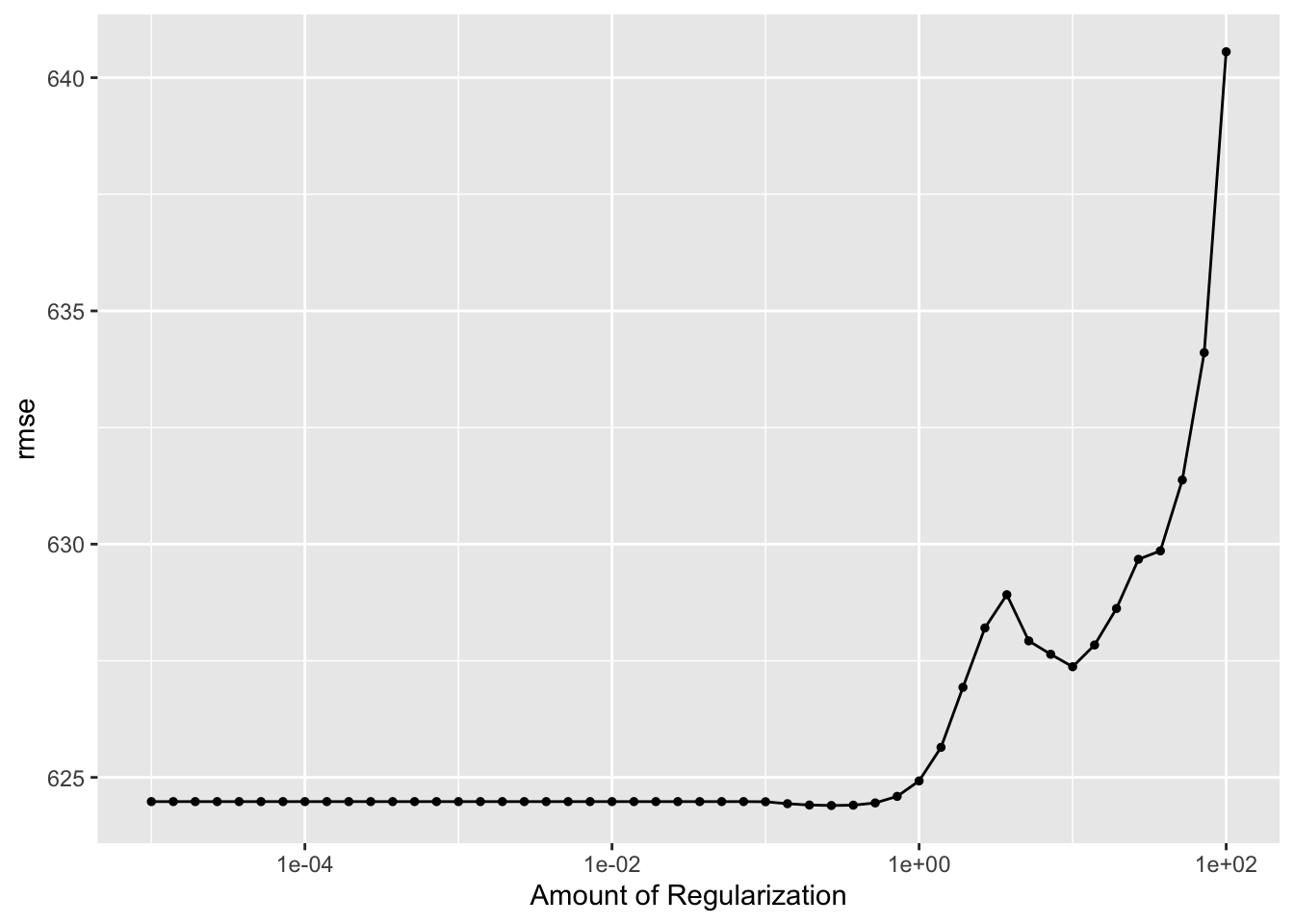 From the graph above of the tuning results (with CV), we see that RMSE remains relatively constant and then suddenly starts to increase as penalty increases.