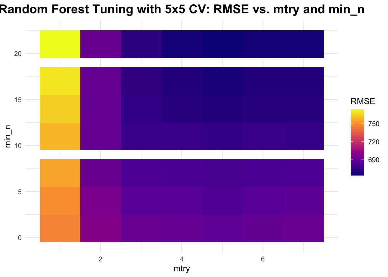 # create 5x5 cross-validation objectcv_folds <-vfold_cv(data, v =5, repeats =5) # same object as above# tune Random Forest model using CVrf_cv_results <-tune_grid( rf_tuning_workflow,resamples = cv_folds,grid = rf_grid,metrics =metric_set(rmse),control =control_grid(save_pred =TRUE))# resultsrf_cv_results_df <-collect_metrics(rf_cv_results)# plot resultsggplot(rf_cv_results_df, aes(x = mtry, y = min_n, fill = mean)) +geom_tile() +scale_fill_viridis_c(option ="plasma", name ="RMSE") +labs(title ="Random Forest Tuning with 5x5 CV: RMSE vs. mtry and min_n",x ="mtry", y ="min_n") +theme_minimal() +theme(plot.title =element_text(hjust =0.5, # center the titleface ="bold", # make title boldsize =16) # make title bigger )