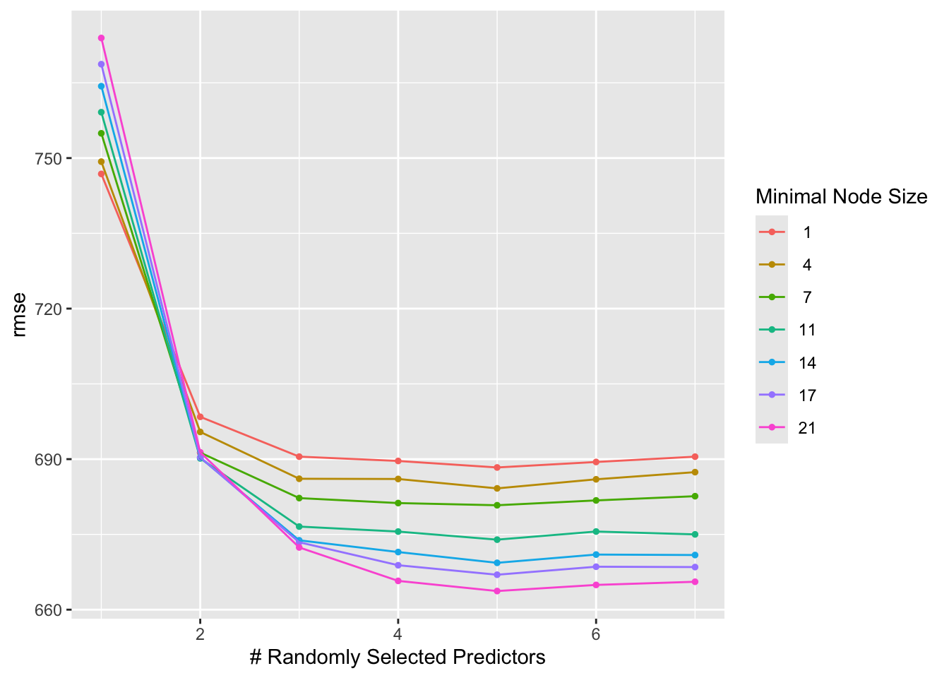 From the graphs above, you can see that RMSE still decreases as mtry increases and that RMSE increases as min_n increases.