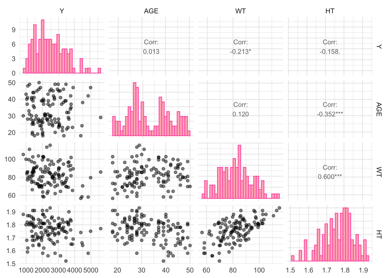 # Select only continuous variablescontinuous_vars <- data %>%select(Y, AGE, WT, HT)# Create a pairwise correlation plotggpairs(continuous_vars, lower =list(continuous =wrap("points", alpha =0.5)), upper =list(continuous =wrap("cor", size =3)),diag =list(continuous =wrap("barDiag", color ="hotpink", fill ="lightpink"))) +theme_minimal()