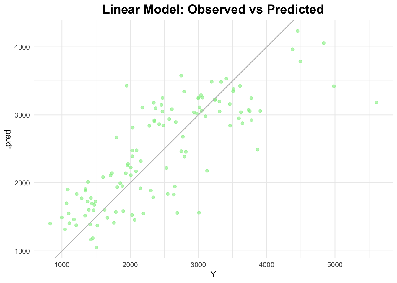 # plot observed vs predictedggplot(lm_predictions, aes(x = Y, y = .pred)) +geom_point(alpha =0.6, color ="lightgreen") +geom_abline(slope =1, intercept =0, color ="gray") +labs(title ="Linear Model: Observed vs Predicted") +theme_minimal() +theme(plot.title =element_text(hjust =0.5, # center the titleface ="bold", # make title boldsize =16) # make title bigger )