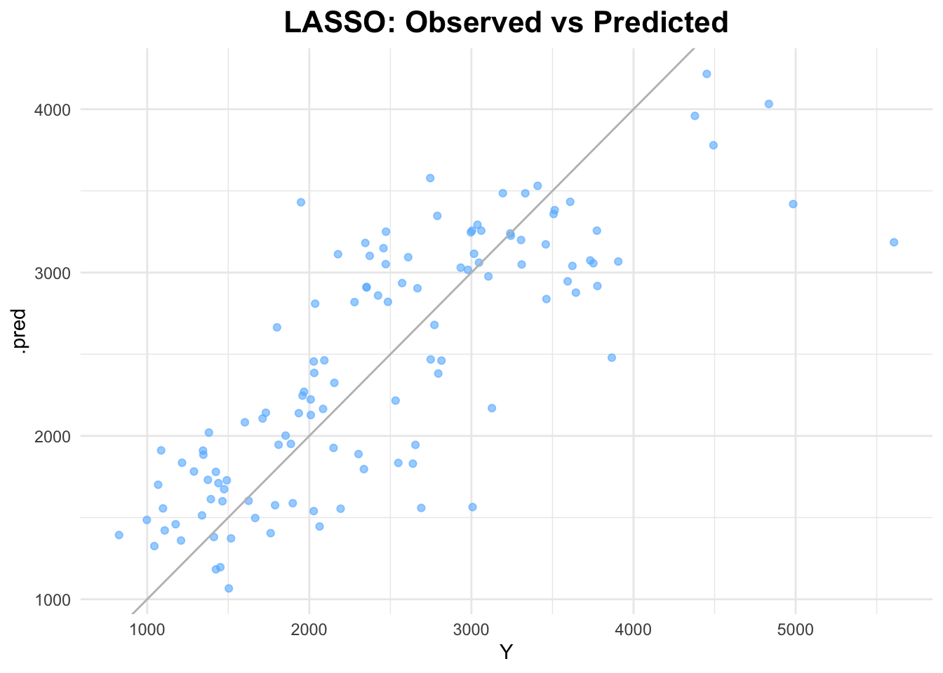 # plot observed vs predictedggplot(lasso_predictions, aes(x = Y, y = .pred)) +geom_point(alpha =0.6, color ="steelblue1") +geom_abline(slope =1, intercept =0, color ="gray") +labs(title ="LASSO: Observed vs Predicted") +theme_minimal() +theme(plot.title =element_text(hjust =0.5, # center the titleface ="bold", # make title boldsize =16) # make title bigger )
